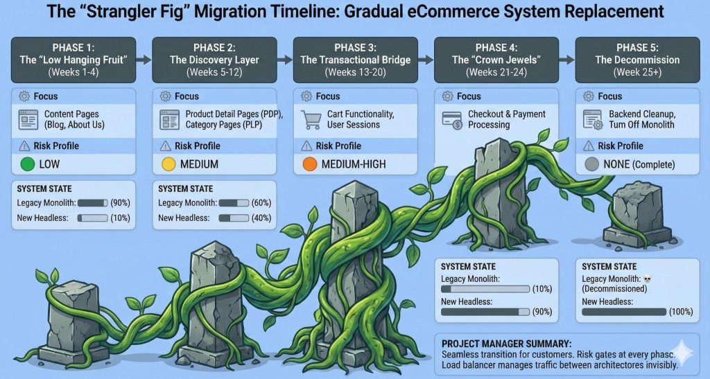 Once the content layer proves stable, you migrate product detail pages. Then category pages. Then cart functionality. Finally, when the entire discovery experience runs on the new stack, you migrate checkout, the crown jewels of your commerce operation. Each phase can take weeks or months, and at every stage, you can pause, validate, and course correct without risk to your core business.