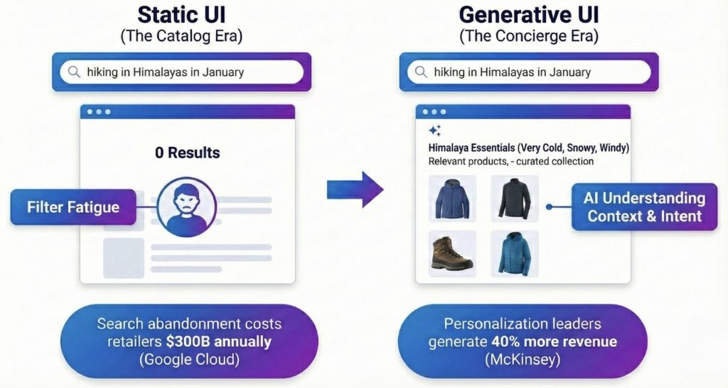In the age of AI, this static model isn’t just outdated—it’s a competitive liability. We’re moving rapidly toward generative UI, where interfaces assemble themselves in real-time and adapt their layout and merchandising to match user intent instead of forcing users to adapt to your navigation structure.