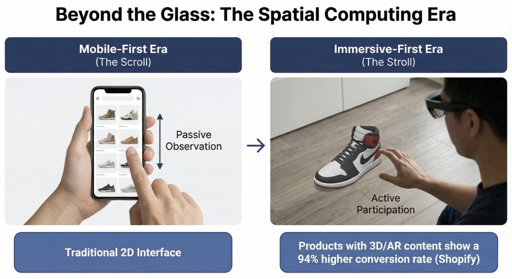 Mobile AR today gives us glimpses of what’s coming. A user points their phone at their living room floor and sees a virtual sneaker appear in actual size, lit by their real lighting. The interface isn’t a grid of product photos, it’s a three dimensional object they can walk around and examine from any angle.