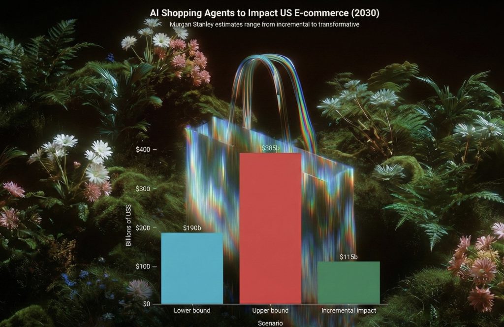 Morgan Stanley scenarios project that by 2030, AI shopping agents could mediate between $190 billion (lower bound) and $385 billion (upper bound) of annual U.S. eCommerce spending, with separate analyses suggesting $115 billion in additional incremental volume beyond baseline projections.