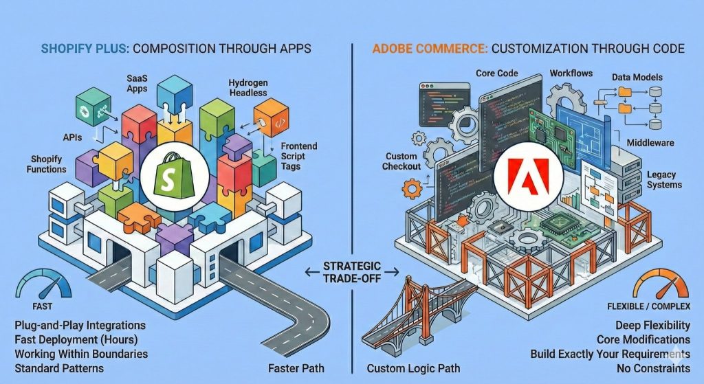 The strategic trade: If your feature needs map to existing apps or standard commerce patterns, Shopify Plus is dramatically faster. If you require custom transaction logic, unique pricing engines, or deep integration with proprietary systems, Adobe Commerce provides the necessary flexibility.