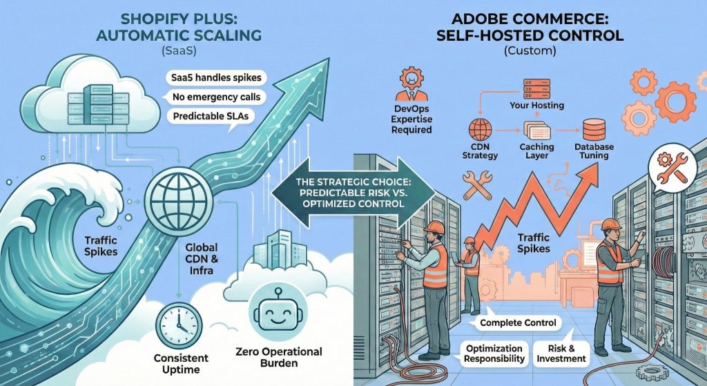 The strategic choice: If you expect unpredictable traffic spikes or massive seasonal campaigns and prefer not to manage infrastructure, Shopify Plus dramatically reduces risk. If you have in-house infrastructure expertise and want to optimize performance at every architectural layer, Adobe Commerce lets you build exactly what you need.