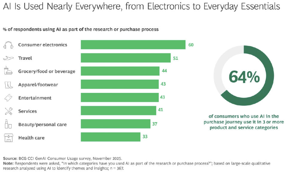 Perhaps the most significant finding in BCG’s research is the breadth of product categories where consumers now deploy AI assistance. While GenAI adoption for high-consideration purchases like smartphones and laptops seems logical, the technology has penetrated deeply into routine, low-stakes purchases.