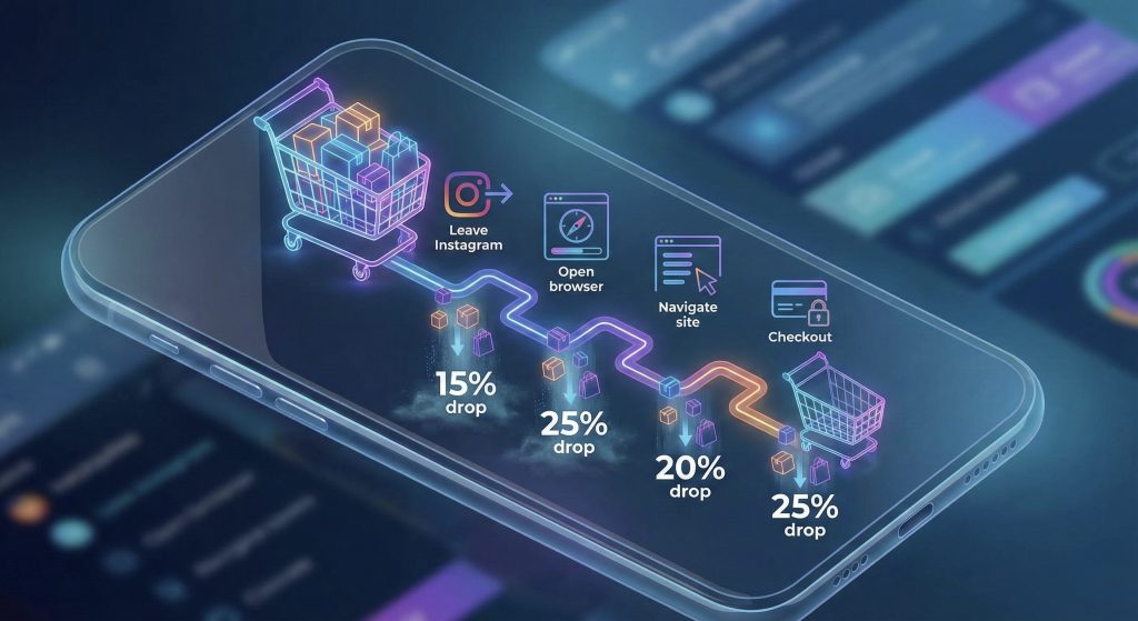On mobile devices, cart abandonment increases to approximately 85%, making mobile checkout the most common drop-off point in the purchase journey. When you add the friction of leaving a social app, opening a browser, navigating your site, and completing checkout on a small screen, you’re compounding these already catastrophic abandonment rates.