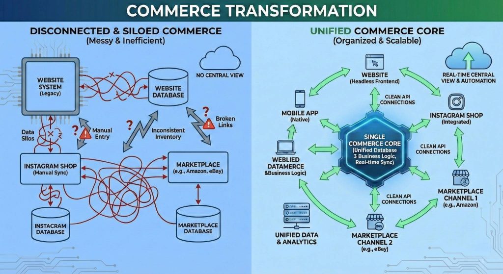 Here’s what headless actually enables: You build your commerce core once, product catalog, inventory management, pricing engine, order processing, customer data. Then you expose that functionality through APIs that any frontend can consume. Instagram Shop, TikTok Shopping, your mobile app, in-store kiosks, voice commerce through Alexa, and yes, your traditional website all pull from the same backend.