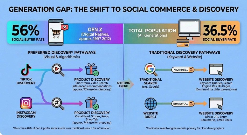 But here’s the statistic that should fundamentally change how you think about your commerce strategy: 60% of Gen Z shoppers discover products through TikTok, Instagram, or YouTube before visiting an online store. Discovery now starts on social platforms, not search engines or brand websites.