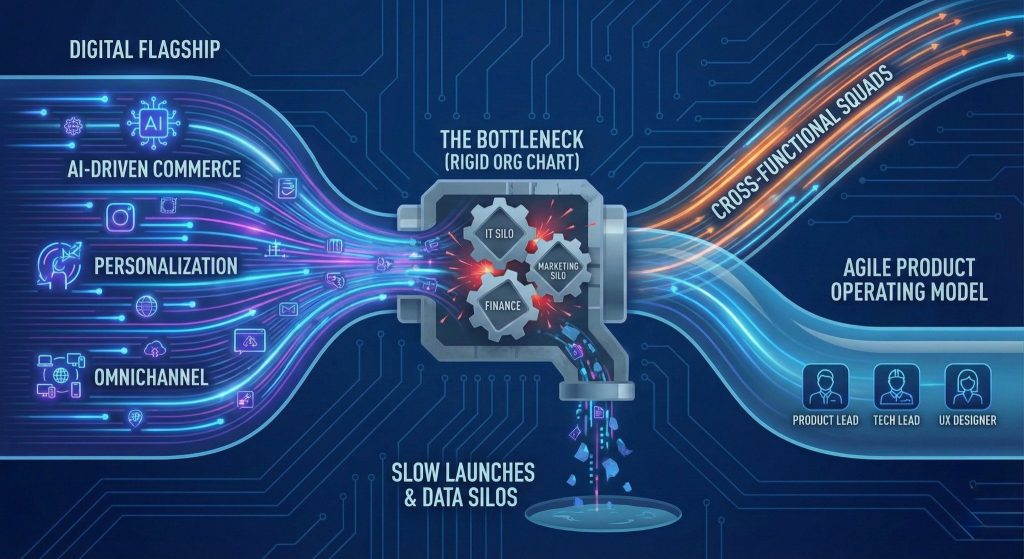 If you want to move at the speed of AI, you can’t organize like it’s 2015. The old model, where eCommerce reports to Retail, IT reports to Operations, and Marketing lives on a different floor, was designed for stability in a slow-moving world.