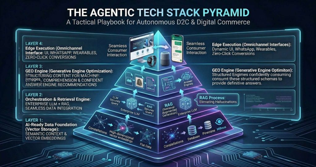 | THE AGENTIC INTELLIGENCE NETWORK: 4-LAYER ARCHITECTURE Layer 1: AI-Ready Data Foundation (Vector Storage) Legacy PIMs store flat data. In the agentic stack, product data is enriched with semantic context and converted into mathematical vectors (embeddings) in databases like Pinecone or Milvus. This enables AI agents to retrieve exact semantic matches instantly. Layer 2: Orchestration & Retrieval Engine (RAG Architecture) Enterprise LLMs combined with Retrieval-Augmented Generation (RAG) force the AI to query your Vector Database before generating any response—eliminating hallucinations. Layer 3: GEO Engine (Generative Engine Optimization Layer) Automatically wraps every product, specification, and brand claim in advanced schema markup. Answer Engines consume these structured schemas natively to recommend your products with confidence. Layer 4: Edge Execution (Omnichannel AI Interfaces) The autonomous system intercepts the consumer via dynamic website UI generation, WhatsApp Business API conversations, or voice-first interfaces in regional languages. |